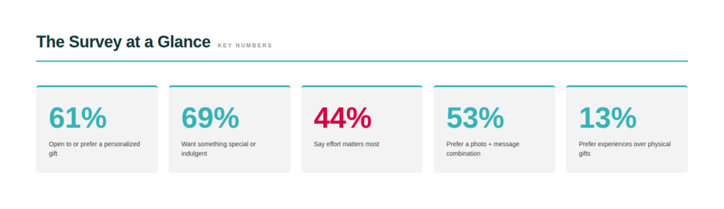 The most telling stat here: 53% of mums said they prefer personalised gifts that combine a photo with a personal message. Photos alone scored 33%, and names or initials without a photo trailed at 9%. Memory beats monogram, basically.