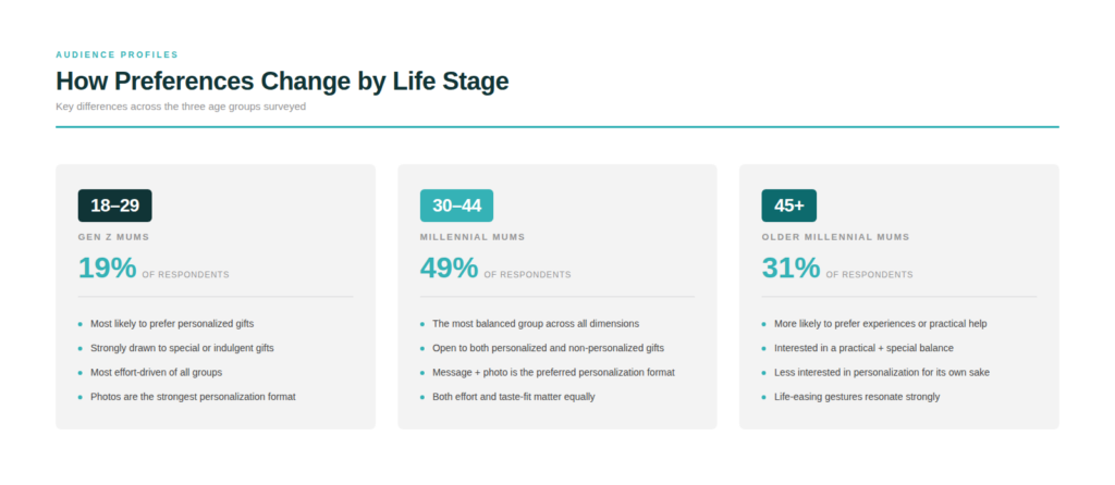 The survey also found that gift preferences shift with life stage. Younger mums were the most enthusiastic about personalised gifts, with 56% of Gen Z mums putting effort at the very top. Millennial mums were more balanced, open to either approach. Older mums leaned towards experiences or practical support.