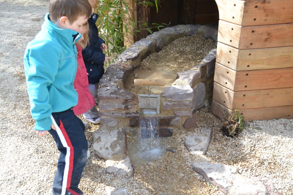 We filled buckets with water and carried them to a reservoir ( shown below), where we watched the water follow a path to a sand pit . Little S was desperate to go in, but today still wasn’t really the weather for it. It will be fantastic in summer though.